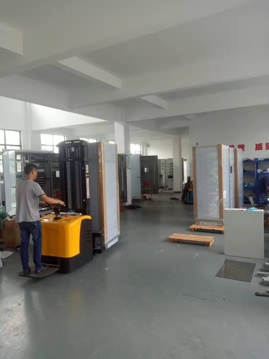 工人將柜子在安裝車間整齊排列