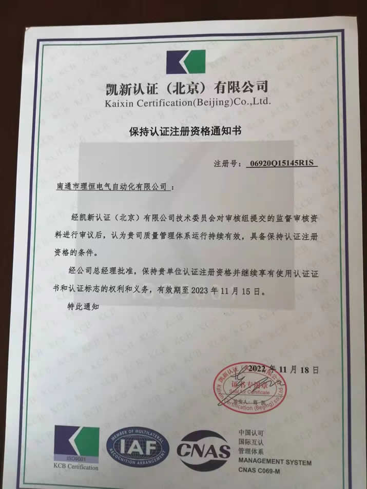 近日,經(jīng)中國質(zhì)量管理體系凱新認證(北京)公司技術委員會專家組人員對我司質(zhì)量管理體系進行監(jiān)督審核,我司質(zhì)量管理體系運行持續(xù)有效,并給我司頒發(fā)了《保持認證注冊資格通知書》。